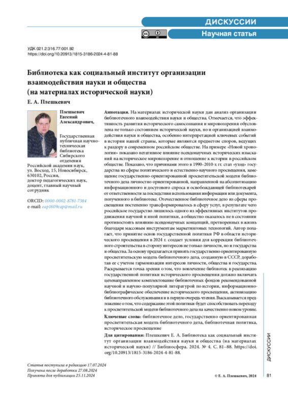 На материалах исторической науки дан анализ организации библиотечного взаимодействия науки и общества. Отмечается, что эффективность развития исторического самосознания и мировоззрения обусловлена не только состоянием исторической науки, но и организацией взаимодействия науки и общества, особенно интерпретацией ключевых событий в истории нашей страны, которые являются предметом споров, ведущих к раздору в современном российском обществе. На примере «Новой хронологии» показано негативное влияние псевдонаучных исторических изысканий на историческое мировоззрение и отношение к истории в российском обществе. Показано, что причинами этого в 1990–2010-х гг. стал «уход» государства из сферы политического и естественно-научного просвещения, замещение государственно-ориентированной просветительской модели библиотечного дела личностно ориентированной, направленной на абсолютизацию информационного и досугового спроса и освобождающей библиотекарей от ответственности за последствия использования информации или документа, полученного в библиотеке. Отечественное библиотечное дело из сферы просвещения постепенно трансформировалось в сферу услуг, в результате чего российское государство лишилось одного из эффективных институтов продвижения научной и иной политики, а общество оказалось не в состоянии противостоять влиянию псевдонаучных концепций, претворенных в жизнь благодаря массовым инструментам маркетинговых технологий. Автор полагает, что принятие основ государственной политики РФ в области исторического просвещения в 2024 г. создает условия для коррекции библиотечного строительства в сторону интересов не только личности, но и государства и общества. За основу предлагается принять государственно ориентированную просветительскую модель библиотечного дела, созданную в СССР, доработав ее с учетом гармонизации интересов личности, общества и государства. Раскрывается точка зрения о том, что вовлечение библиотек в реализацию государственной политики исторического просвещения должно включать целенаправленное комплектование библиотечных фондов рекомендованной научной и научно-популярной литературой по истории, информационно-библиографическое обеспечение исторического просвещения, активизацию библиотечного обслуживания и в первую очередь чтения. Высказывается предложение о том, что содержание этой политики будет способствовать переходу к просветительской модели библиотечного дела на качественно новом уровне.