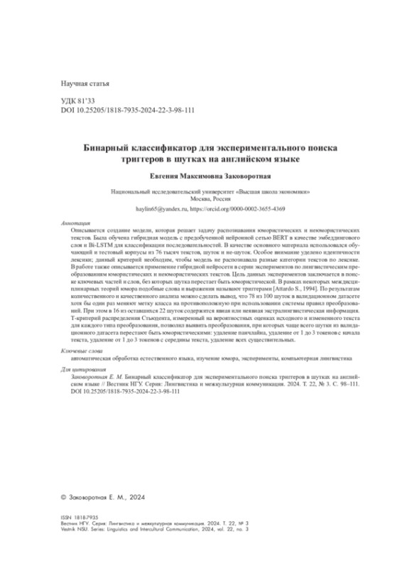 Статья: Бинарный классификатор для экспериментального поиска триггеров в шутках на английском языке