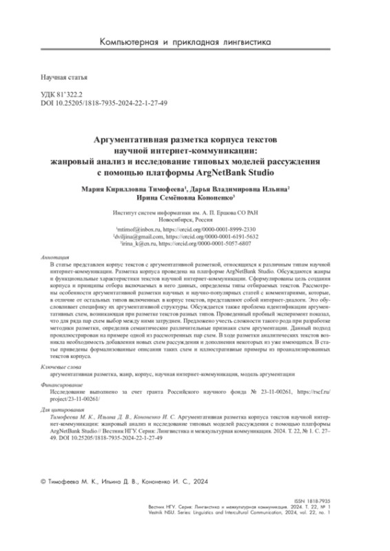 Статья: Аргументативная разметка корпуса текстов научной интернет-коммуникации: жанровый анализ и исследование типовых моделей рассуждения с помощью платформы ArgNetBank Studio