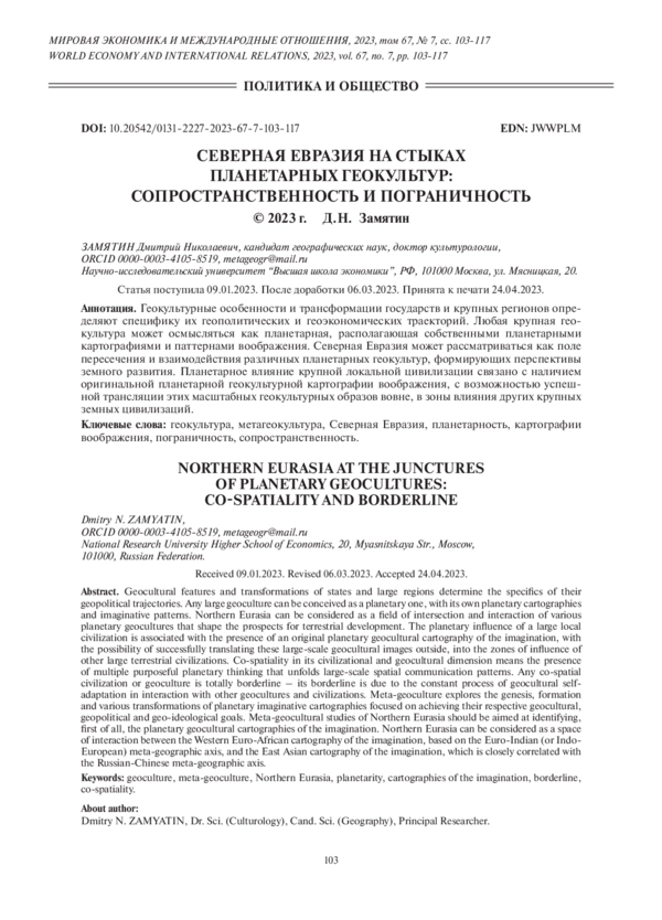 Статья: СЕВЕРНАЯ ЕВРАЗИЯ НА СТЫКАХ ПЛАНЕТАРНЫХ ГЕОКУЛЬТУР: СОПРОСТРАНСТВЕННОСТЬ И ПОГРАНИЧНОСТЬ