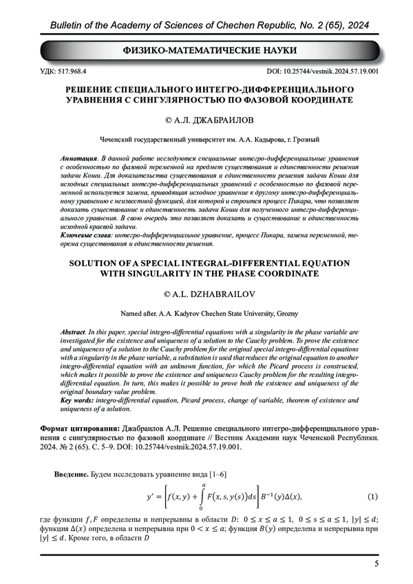 Статья: РЕШЕНИЕ СПЕЦИАЛЬНОГО ИНТЕГРО-ДИФФЕРЕНЦИАЛЬНОГО УРАВНЕНИЯ С СИНГУЛЯРНОСТЬЮ ПО ФАЗОВОЙ КООРДИНАТЕ