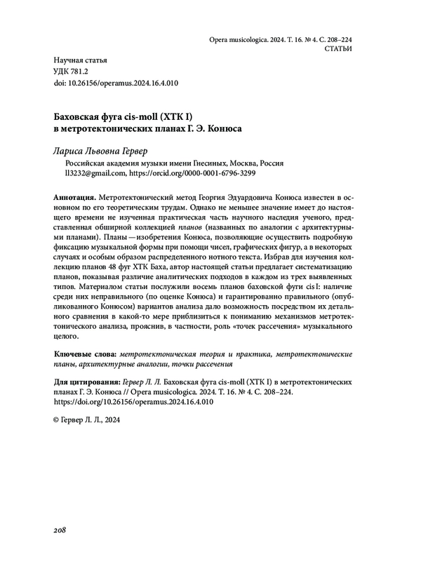 Статья: БАХОВСКАЯ ФУГА CIS-MOLL (ХТК I) В МЕТРОТЕКТОНИЧЕСКИХ ПЛАНАХ Г. Э. КОНЮСА