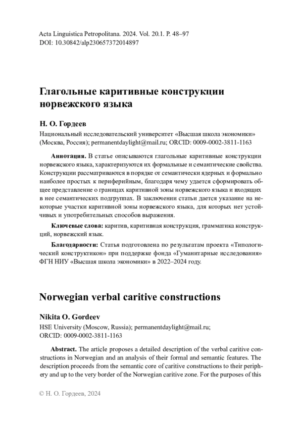 В статье описываются глагольные каритивные конструкции норвежского языка, характеризуются их формальные и семантические свойства. Конструкции рассматриваются в порядке от семантически ядерных и формально наиболее простых к периферийным, благодаря чему удается сформировать общее представление о границах каритивной зоны норвежского языка и входящих в нее семантических подгруппах. В заключении статьи дается указание на некоторые участки каритивной зоны норвежского языка, для которых нет устойчивых и употребительных способов выражения.