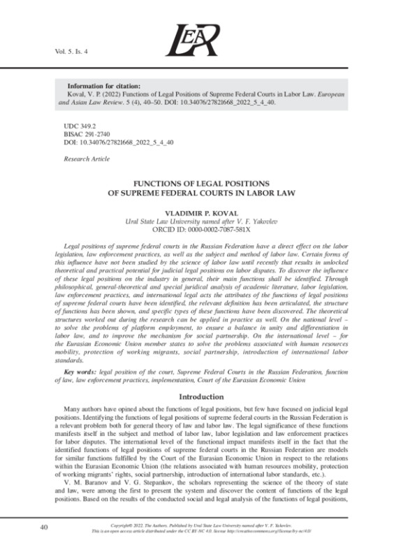 Статья: FUNCTIONS OF LEGAL POSITIONS OF SUPREME FEDERAL COURTS IN LABOR LAW