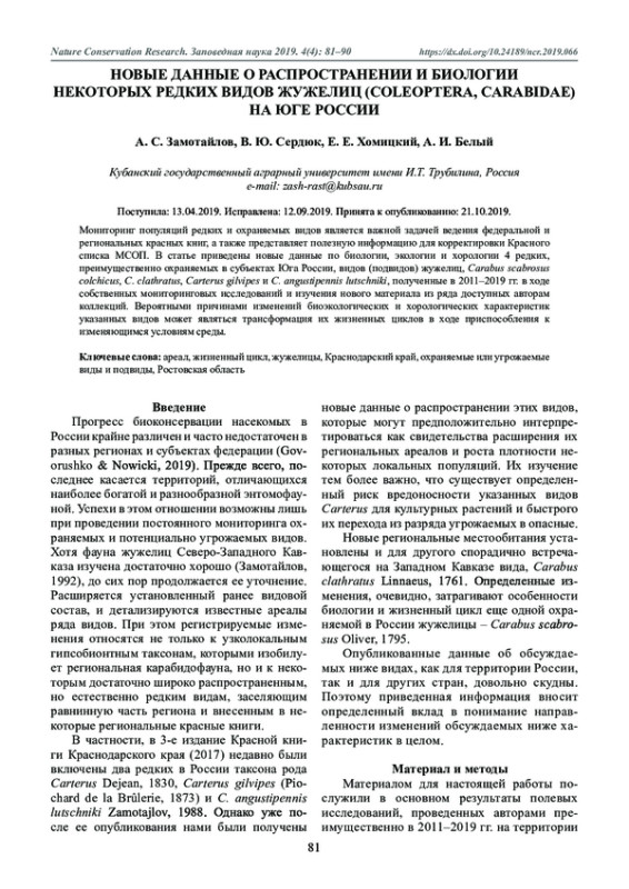 Мониторинг популяций редких и охраняемых видов является важной задачей ведения федеральной и региональных красных книг, а также представляет полезную информацию для корректировки Красного списка МСОП. В статье приведены новые данные по биологии, экологии и хорологии 4 редких, преимущественно охраняемых в субъектах Юга России, видов (подвидов) жужелиц, Carabus scabrosus colchicus, C. clathratus, Carterus gilvipes и C. angustipennis lutschniki, полученные в 2011-2019 гг. в ходе собственных мониторинговых исследований и изучения нового материала из ряда доступных авторам коллекций. Вероятными причинами изменений биоэкологических и хорологических характеристик указанных видов может являться трансформация их жизненных циклов в ходе приспособления к изменяющимся условиям среды.