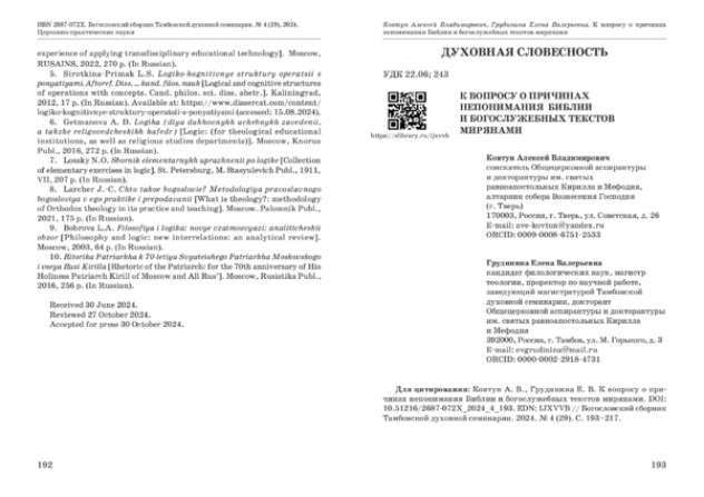 Статья посвящена актуальной для православного богословия, но малоизученной на уровне науки проблеме – причинам непонимания Библии и богослужебных текстов современными носителями русского языка. В данной работе произведена систематизация различных случаев непонимания священных текстов на церковнославянском языке и на их основе создана типология герменевтических неудач (ситуаций непонимания). К первой группе относятся ситуации непонимания, связанные с затруднениями восприятия незнакомой речи на слух, причиной которых является несоблюдение правил церковного пения и чтения. Во вторую группу включены причины непонимания, обусловленные незнанием грамматики и лексики языка оригинального текста Библии и богослужебных книг, что может привести к неверным переводам последних на целевой язык. Основной причиной непонимания Священного Писания и богослужебных текстов, по мнению авторов, является неосведомленность многих мирян в сфере православного вероучения, а также отсутствие личного духовного опыта у людей, приступающих к чтению Священного Писания и богослу‑ жебных текстов на церковнославянском языке. В заключение сделан вывод о том, что раскрытие основных причин непонимания богослужебных и священных текстов позволит внести некоторые дополнения в теологическое образование, в частности сделать более осознанным процесс изучения Священного Писания и восприятия богослужения мирянами.