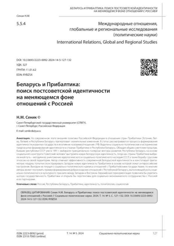 На современном этапе внешняя политика Российской Федерации в отношении стран Прибалтики (Эстония, Литва, Латвия) и Республики Беларусь претерпевает значительные изменения. В статье рассматриваются процессы формирования идентичности указанных государств и их влияние на взаимоотношения с РФ. Выделены социально-политические и исторические предпосылки формирования идентичности в странах Прибалтики и Республики Беларусь. Обладая общим советским прошлым, бывшие республики СССР уже в 1991 г. выбирали принципиально полярные векторы развития. Республика Беларусь на основе социального конструкта “советский человек” выстроила новую белорусскую идентичность, тогда как страны Прибалтики выбрали иной путь - методичное уничтожение идеологического и социально-политического наследия СССР, а также борьбу с русским этносом на своей территории. Автор отмечает эффективность современной белорусской идентичности и констатирует фактическую неудачу попытки сконструировать Западом новую идентичность Прибалтики в основе которой лежат антироссийские настроения. Выходом из текущего социально-политического кризиса отношений с Прибалтийскими государствами, по мнению автора, может послужить пример формирования добрососедских отношений с Республикой Беларусь, выполняющей роль социально-политического и культурного транзита между Западом и Востоком. Евразийская переориентация позволила бы укрепить шаткую государственность Прибалтики и открыла бы перспективы для социально-экономического сотрудничества с Россией и ее партнерами.