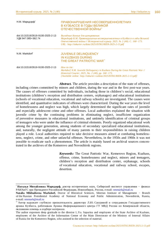 Маркдорф Н.М. Правонарушения несовершеннолетних в Кузбассе в годы Великой Отечественной войны // Исторический курьер. 2025. № 2 (40). С. 160−173. URL: http://istkurier.ru/data/2025/ISTKURIER-2025-2-13.pdf