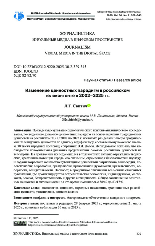 Статья: ИЗМЕНЕНИЕ ЦЕННОСТНЫХ ПАРАДИГМ В РОССИЙСКОМ ТЕЛЕКОНТЕНТЕ В 2002-2025 ГГ.