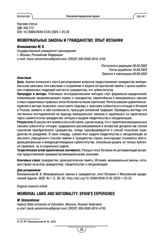 Цель. Анализ испанского опыта регулирования вопросов предоставления гражданства мемориальными законами, или законами о сохранении и защите исторической памяти с целью выявления современных тенденций института гражданства, его субинститутов.