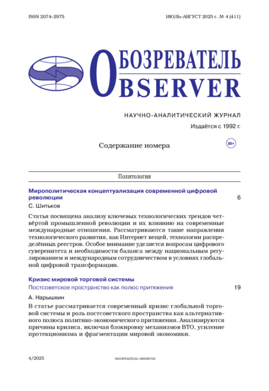 Статья посвящена анализу ключевых технологических трендов чет вёртой промышленной революции и их влиянию на современные международные отношения. Рассматриваются такие направления технологического развития, как Интернет вещей, технологии распре делённых реестров. Особое внимание уделяется вопросам цифрового суверенитета и необходимости баланса между национальным регу лированием и международным сотрудничеством в условиях глобаль ной цифровой трансформации.