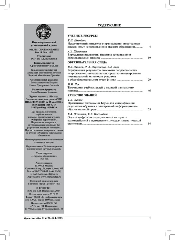 Заключение. В результате анализа успешных кейсов, реализованных в различных университетах, автором систематизированы модели организации учебного процесса с использованием VR-технологий. Рассмотренные вопросы могут стать основой для разработки стандартов VR-обучения, создания адаптивных образовательных программ и рекомендаций для педагогов и разработчиков EdTech.