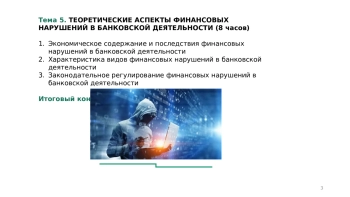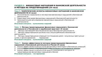 В презентации рассматриваются экономическое содержание и последствия финансовых нарушений в банковской деятельности; дается характеристика финансовых нарушений в банковской деятельности и законодательное регулирование финансовых нарушений в банковской деятельности.